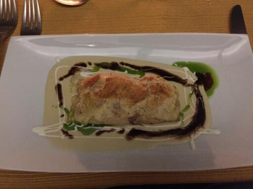 O primeiro prato do menu principal foi um filé de peixe com queijo brie e um molho de vinho branco extremamente complexo, receita secreta do chef Gérard. Peixe com queijo já é uma dificuldade e nos aventuramos ainda mais ao harmonizar esse prato com um Tamaya Reserva Pinot Noir chileno da região de Limari. Vinho tinto com um marcante aroma de frutas vermelhas e toques herbáceos conseguiu, com sua leveza e acidez, acompanhar muito bem o prato de peixe. Confesso que fiquei surpreso positivamente com o resultado, mas ainda ficaria com o vinho da entrada para acompanhar também esse prato.
