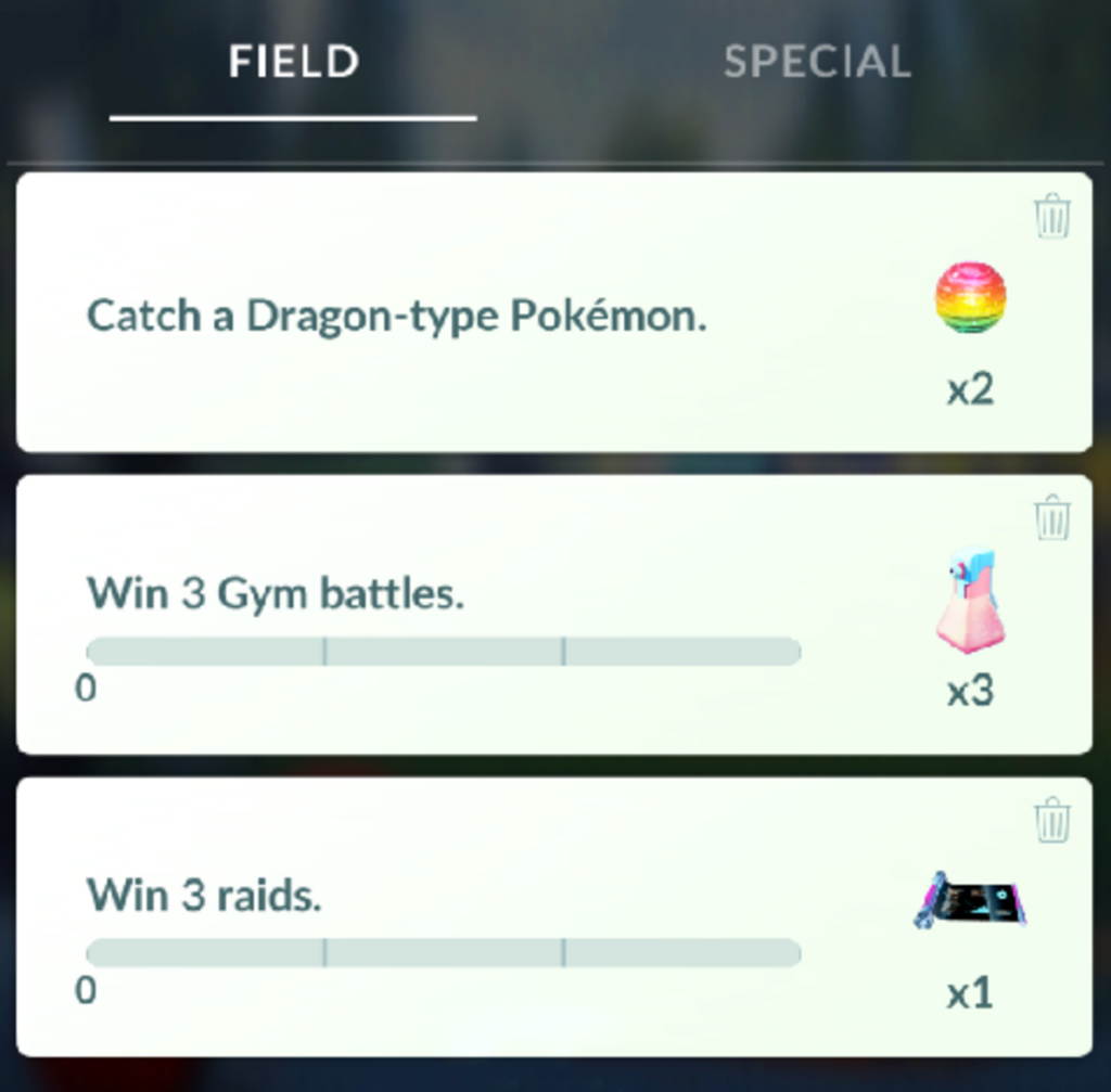 Toda vez que você girar um pokéstop (locais de cor azul que aparecem no mapa, e que presenteiam com uma série de itens toda vez que são inspecionados), uma missão aleatória será adicionada à sua lista de tarefas. Estes objetivos vão desde tarefas simples como capturar um determinado número de pokémons até a obtenção de êxito em batalhas de um ginásio ou de uma raid. Ao cumprir o que é solicitado, o jogador será recompensado com presentes, como pokébolas, pontos de experiência para evoluir ou ainda a possibilidade de capturar um Pokémon raro.