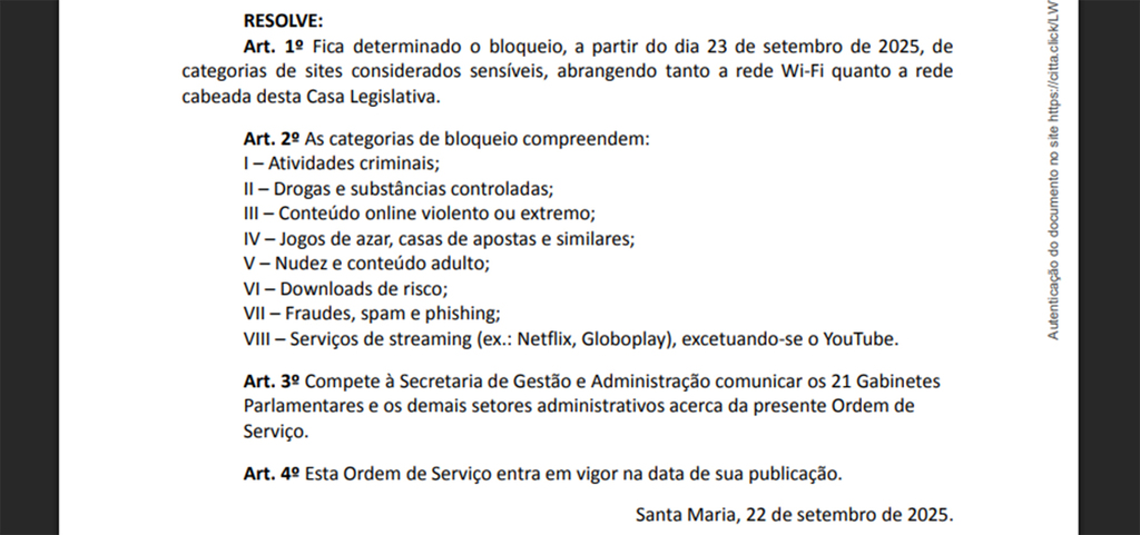 A ordem passou a valer dia 23 e compreende bloqueio “de sites considerados sensíveis, abrangendo tanto a rede Wi-Fi quanto a cabeada desta Casa”. Estão listados os seguintes sites/acessos bloqueados: Atividades criminais; Drogas e substâncias controladas; Conteúdo online violento ou extremo; Jogos de azar, casas de apostas e similares; Nudez e conteúdo adulto; Downloads de risco; Fraudes, spam e phishing; VIII – Serviços de streaming (ex.: Netflix, Globoplay), excetuando-se o YouTube.