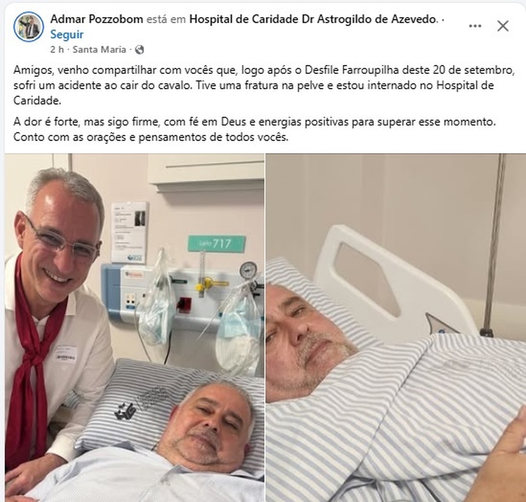 "Amigos, venho compartilhar com vocês que, logo após o Desfile Farroupilha deste 20 de setembro, sofri um acidente ao cair do cavalo. Tive uma fratura na pelve e estou internado no Hospital de Caridade. A dor é forte, mas sigo firme, com fé em Deus e energias positivas para superar esse momento. Conto com as orações e pensamentos de todos vocês."