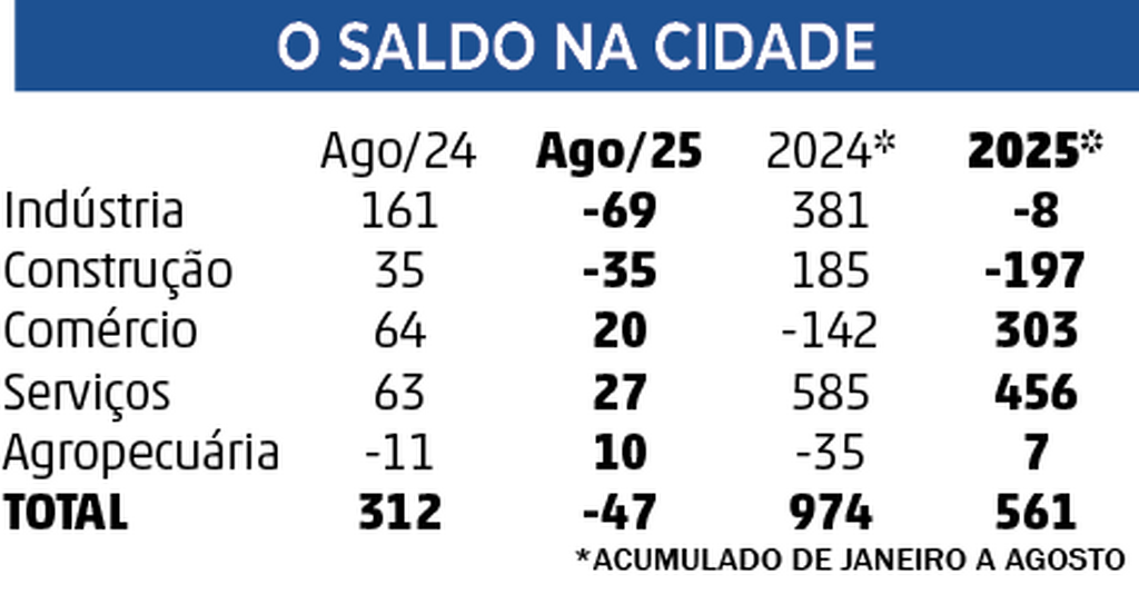Ainda no acumulado do ano, os setores com pior resultado e que mais puxaram o saldo para baixo foram da construção civil e da indústria. Enquanto em 2024, de janeiro a agosto, a indústria havia criado 381 novos postos, este ano está no negativo, com -8. Já a construção havia gerado 185 empregos nos oito primeiros meses de 2024, mas agora amarga um saldo bem negativo, de -197 – ou seja, um corte expressivo de trabalhadores com carteira assinada.