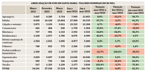 Os setores de Santa Maria que tiveram maiores crescimento de arrecadação do ICMS no 1º trimestre deste ano, em comparação ao mesmo período de 2022, foram os de bebidas (91,3%), veículos (75,4%), agronegócio (50,7%), supermercados (50,6%), transportes (43,9%) e eletrônicos (36,2%). Esses são percentuais que levam em conta os valores nominais (da época). Se for atualizado pela inflação, os percentuais ficam um pouco menores. Mesmo assim, é uma grande recuperação em relação a 2022, quando já não havia mais restrições ao comércio e à circulação de pessoas em função da pandemia da Covid-19.