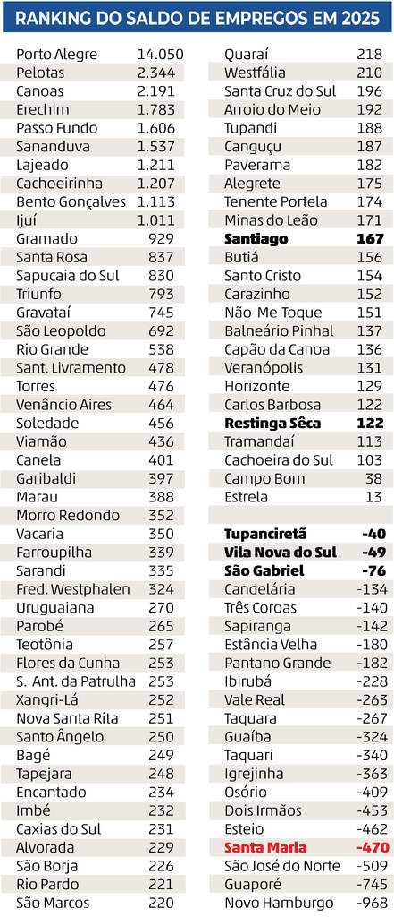 Depois de ter sido a 12ª cidade do Estado que mais gerou empregos com carteira assinada em 2023, e a 11ª em 2024, Santa Maria amargou um resultado bem negativo em 2025. No ranking dos 497 municípios gaúchos, Santa Maria foi a 4ª que teve mais cortes de vagas: o saldo ficou em -470 empregos, resultado de 32.912 contratações contra 33.382 demissões nos 12 meses do ano. Só três cidades tiveram mais cortes do que Santa Maria (veja quadro abaixo).