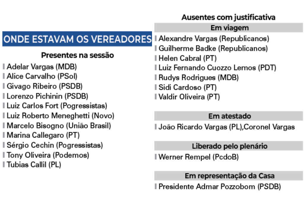 A falta de quórum na sessão da quinta-feira (16) inviabilizou a votação de projetos. Seriam necessários, no mínimo, 11 dos 21 parlamentares e tinham, no momento, 10. Já para o funcionamento da sessão, é preciso de sete vereadores.