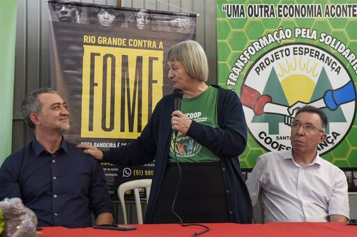 Em Santa Maria, Edegar (à esq.) esteve no Centro de Referência em Economia Solidária Dom Ivo Lorscheiter para conversar com agricultores familiares, representantes do Conselho Municipal de Segurança Alimentar e Nutricional (Consea) e do Diretório Central dos Estudantes (DCE). Na pauta, a produção de alimentos no combate à fome. Além do deputado Valdeci (à esq.), quem participou do encontro foi a ex-coordenadora do Projeto Esperança/Coosperança, irmã Lourdes Dill, que atualmente atua no Maranhão, mas já se prepara para um trabalho em Moçambique, na África.