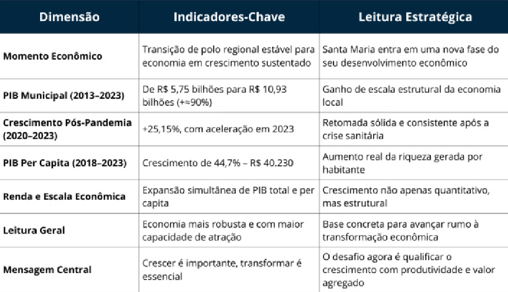 O retrato atual é de uma cidade em transição. Santa Maria cresce, empreende e se diversifica. O desafio agora é transformar esse crescimento em desenvolvimento sustentável, com mais produtividade, inovação e valor agregado. O futuro passa pela indústria leve e tecnológica, pelos serviços intensivos em conhecimento e pela economia criativa como estratégia urbana.