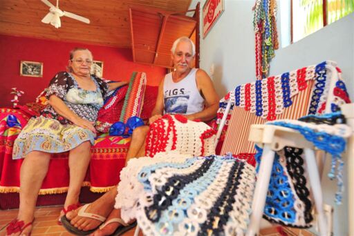 guardanapos, capa para garrafa térmica e jogos de banheiro. Tudo produzido com linha, barbante e lacres de latinhas de refrigerante. E, se alguém pedir, eles fazem muito mais: pintam, bordam e costuram. É assim que a aposentada Geneci Moraes Borin, 64 anos, e o marido, Celso Tarcisio Borin, 59 anos, encontram um jeitode aumentar a renda da família.
