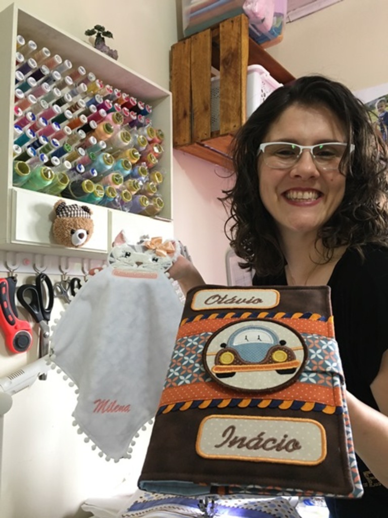 - Os produtos são lindos e de qualidade. A Aline faz tudo personalizado, conforme nossas escolhas. Já comprei capa de caderneta de vacinação, saquinho de tecido, kit higiene e mochila - conta a cliente.