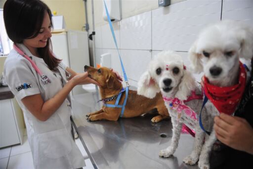 O vira-lata Ted e o poodle Toby (à dir.) tiveram gripe. Os dois e a poodle Lady são pacientes da veterinária Letícia