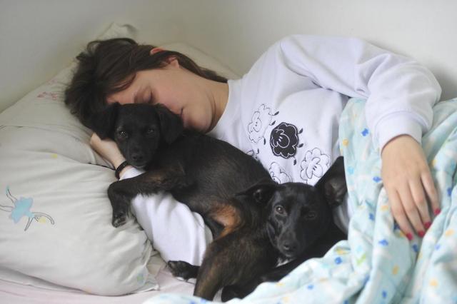 A estudante Caroline Viviane Brun Peres, 21 anos, convive com a companhia das cachorrinhas Paçoca e Dulce há cerca de um ano. Desde então, as duas dormem junto com a dona. Os problemas de insônia que Caroline tinha antes de adotá-las praticamente sumiu com a presença das mascotes na cama.