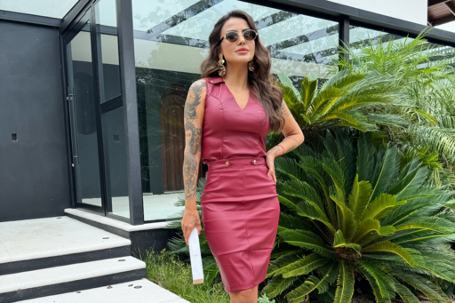 A cor da temporada! O cranberry – um vermelho-arroxeado quente – é a aposta para quem quer ousar sem medo. Este conjunto em courino na cor são peças marcantes e cheias de sofisticação. A blusa tem decote em “V” e botões dourados nos ombros, enquanto a saia ajustada traz botões decorativos na cintura, garantindo a harmonia entre as peças. A cor também funciona como ponto focal em conjuntos neutros (ex.: blazer azul marinho + calça preta + lenço cranberry).