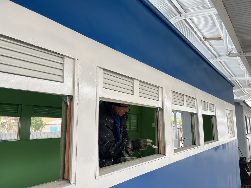 - Começou por – Retirada da ferrugem da locomotiva com a limpeza, aplicação do produto conversor (para paralisar a ferrugem), fundo prime (protetor) e pela soldagem da estrutura