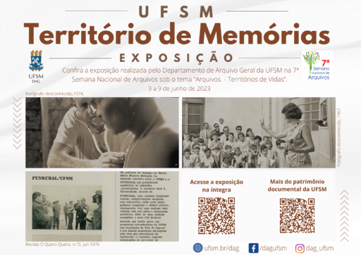 E parte desse grande acervo do Departamento de Arquivo Geral da UFSM também poderá ser conferida pela comunidade santa-mariense a partir deste fim de semana. A exposição UFSM: Território de Memórias estará na edição especial do Viva o Campus, no domingo, 4 de junho, e também no Espaço UFSM do Shopping Praça Nova até o dia 9 de junho.