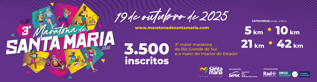 A maratona tem largada às 6h, com as provas de 42 km e 21 km, e às 6h50min para as de 10 km e 5 km, partindo da Rua Pinto Bandeira. O evento é uma realização da prefeitura de Santa Maria, com organização do Sesc Santa Maria.
