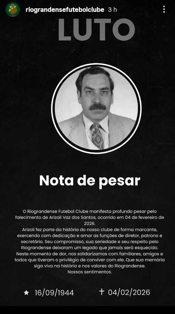 Ainda na nota, o Riograndense se solidariza com familiares, amigos e todos que conviveram com Arizoli, destacando que sua memória seguirá viva na história e nos valores do clube.