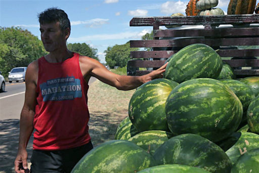 Há mais de 10 anos, o produtor Valdair Olionato, 49 anos, estaciona a sua camioneta às margens da Faixa Nova, em Santa Maia, para vender parte do que cultiva na propriedade da família, em Pains. Na lavoura de cerca de 4 hectares, o rendimento já chegou, na safra passada, a colher 1 mil melancias por dia. Neste verão, devido à condições climáticas, esse número caiu para cerca de 300 unidades.