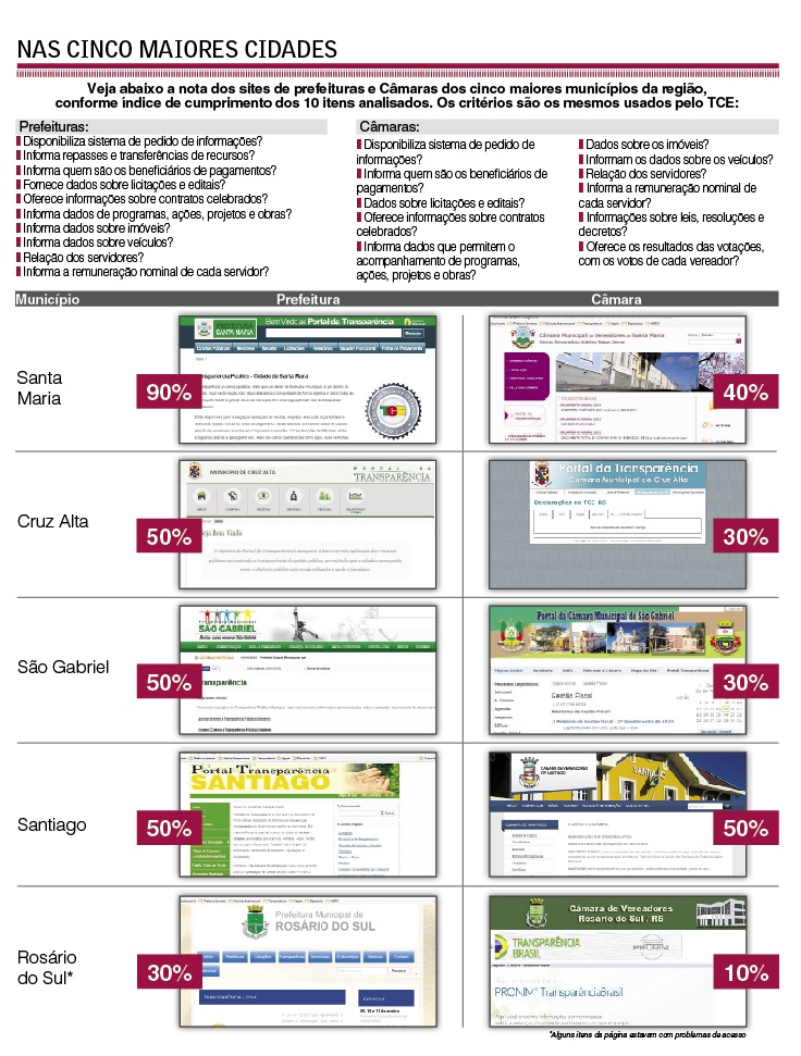 Baseado em recente estudo do Tribunal de Contas do Estado (TCE), que apontou que apenas 20% das prefeituras e 5% das Câmaras de Vereadores do Rio Grande do Sul cumprem as principais exigências da Lei de Acesso à Informação em suas páginas na internet, o "Diário" analisou como é tratado o assunto nos cinco maiores municípios de sua área de cobertura. Na pesquisa do TCE, sete sites da região (veja quadro) foram apontados como destaque pela qualidade das informações apresentadas em suas páginas.