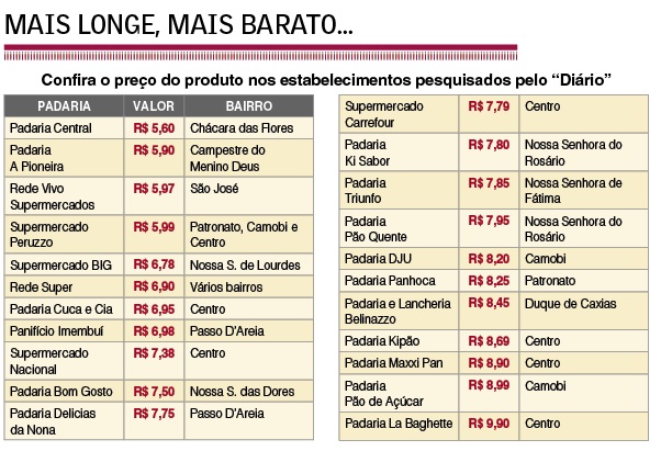 Os três estabelecimentos que vendem pães mais baratos ficam em bairros, e os três mais caros, na região central da cidade - justamente onde há mais padarias próximas uma das outras. O consumidor que se dispuser a andar uma ou duas quadras a mais pode economizar alguns centavos todos os dias.