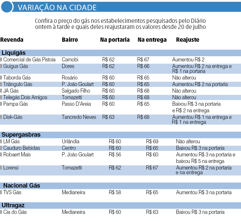 Em relação ao último levantamento, feito em 20 de julho nos mesmos estabelecimentos, quatro mantiveram os preços e 10 mudaram o valor cobrado. O principal motivo das revendas que aumentaram foi o reajuste de 6,9% anunciado pela Petrobras no início de agosto. O índice representa, nos casos em que foram repassados integralmente ao consumidor, um aumento de R$ 1,29 por botijão, ou 2,2% em média. Mas o valor por botijão subiu de R$ 2 a R$ 3 (veja quadro). Dos que não ajustaram, a justificativa é em função das vendas.
