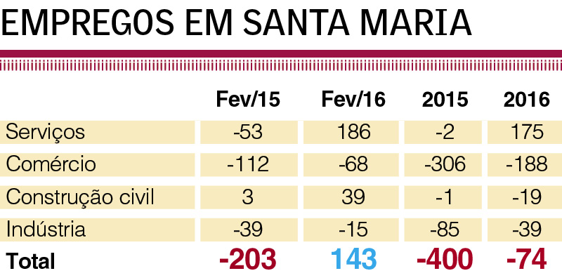 No acumulado do primeiro bimestre, o saldo é negativo, com o fechamento de 74 empregos em Santa Maria, mas o número era bem pior no mesmo período de 2015, quando haviam sido cortados 400 postos de trabalho.