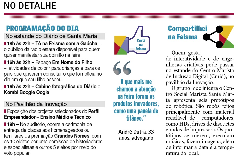 No espaço que concentra o que há de mais inovador na cidade, seja nas empresas, seja nas instituições de ensino, há muito o que ver. Logo na entrada, no estande da Rota Simuladores chega a formar fila dos interessados em dirigir no simulador desenvolvido para centros de formação de condutores. A empresa santa-mariense foi uma das primeiras do país a ter autorização para vender o equipamento. No pavilhão também é possível conhecer empresas das incubadoras e do Tecnoparque e votar nos projetos inovadores de estudantes candidatos do Perfil Empreendedor.