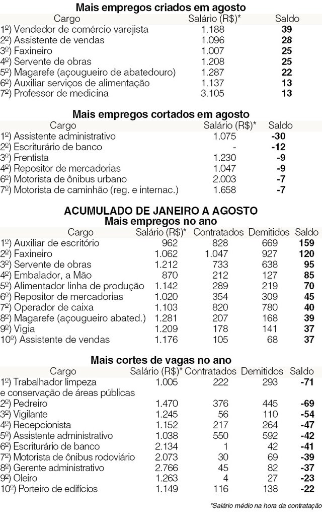 Assim como era esperado, o cargo de vendedor do comércio varejista foi o que teve maior saldo positivo em agosto, devido às contratações de lojas no novo shopping. Foram 215 admissões e 176 demissões de vendedores em agosto, com saldo de 39 novos empregos na cidade – em julho, tinham sido 171 contratações e 190 demissões, dando saldo de -19 vendedores.