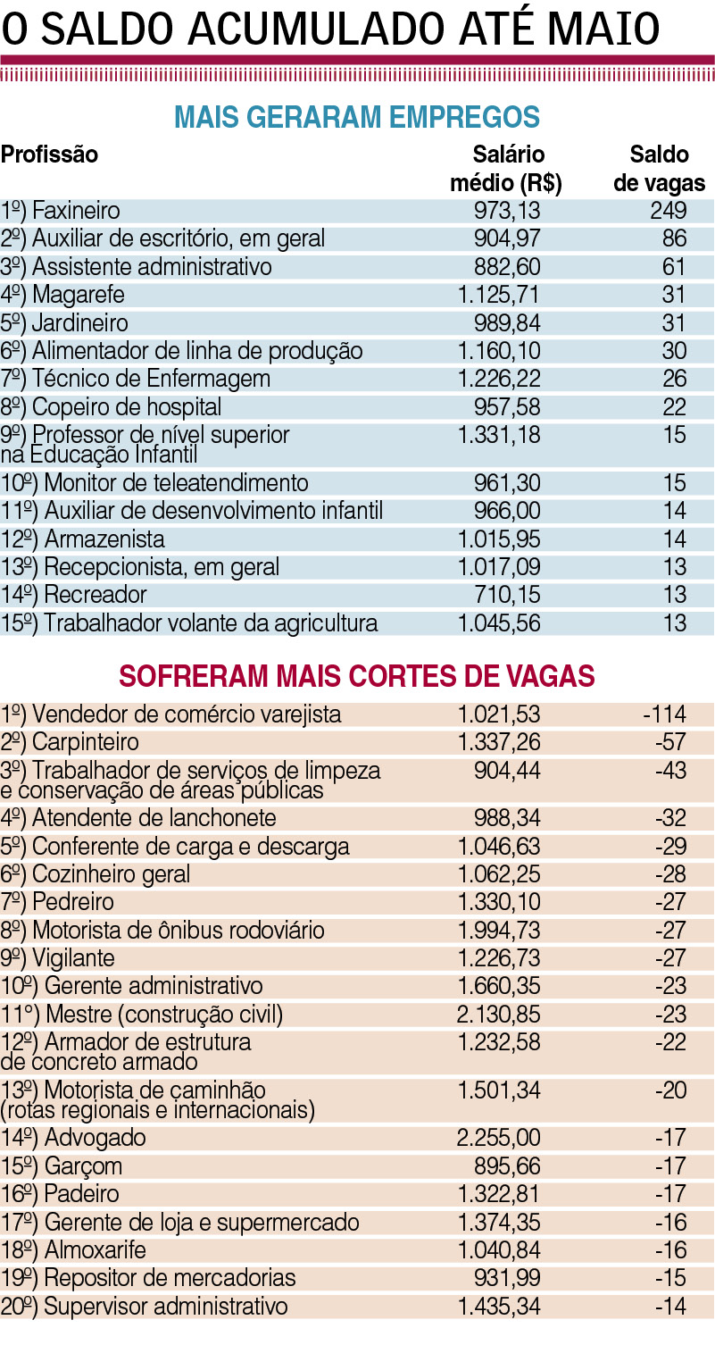 Nos últimos 12 meses, o saldo é ainda pior para vendedor, com -179 vagas. Já faxineiro é a profissão que mais gerou novos empregos este ano, com 249 vagas criadas.