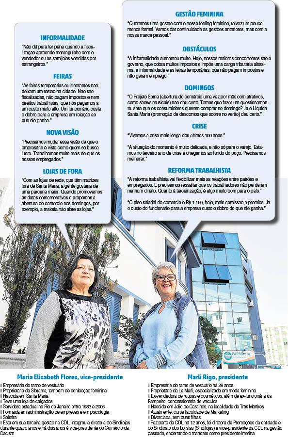Pela primeira vez, em sua história, uma das mais importantes entidades empresariais de Santa Maria tem duas mulheres no comando. Fundada em agosto de 1964, a Câmara de Dirigentes Lojistas (CDL) é presidida por Marli Rigo desde maio de 2016. Reeleita em 6 de junho, Marli tem como vice Maria Elizabeth Flores, fato pioneiro na entidade que completará 53 anos no dia 28.