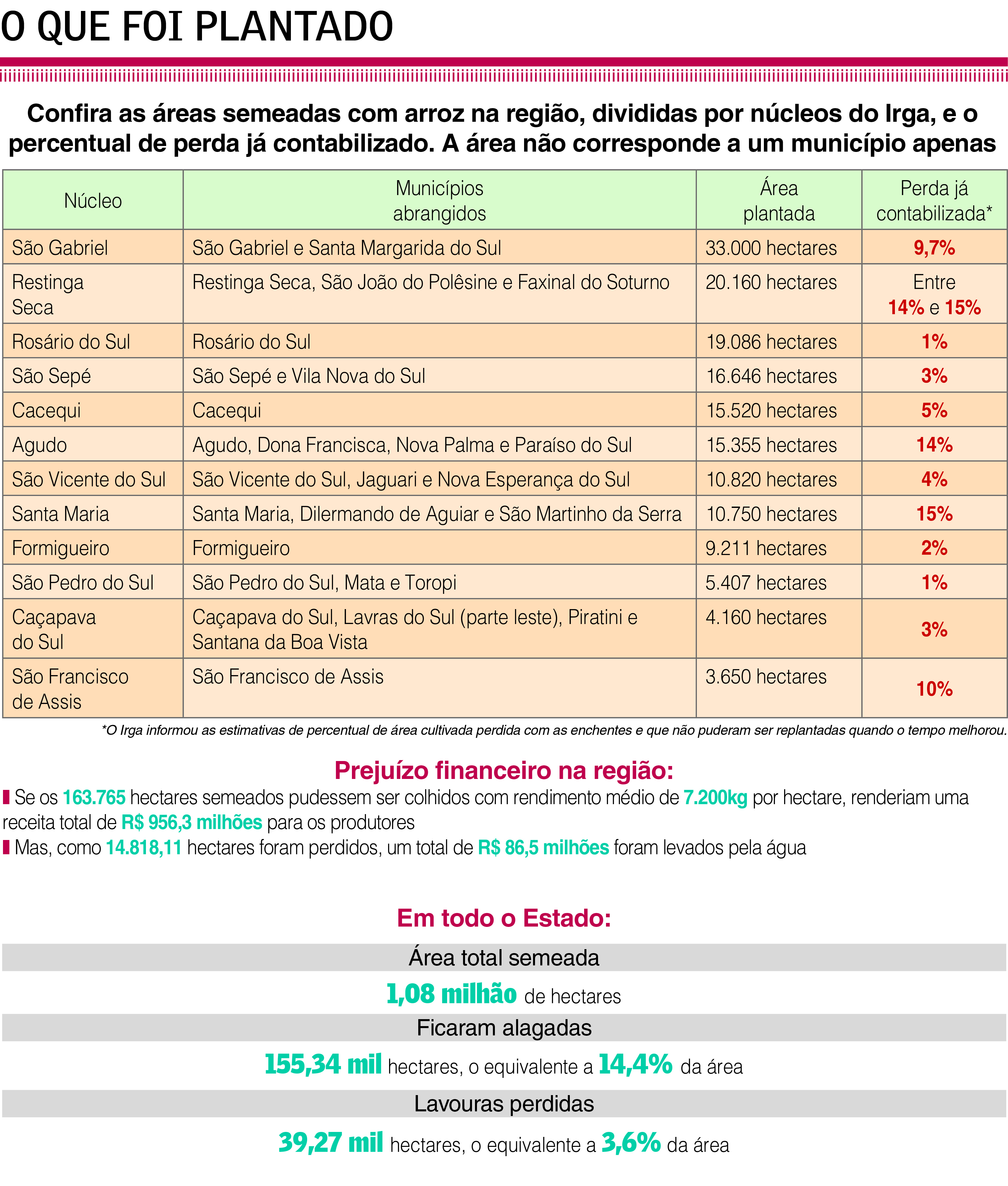 As quebras nas lavouras de arroz da região são diferentes em cada local. Um levantamento junto aos 12 núcleos do Irga da região, que compreendem 27 cidades, mostra percentuais discrepantes. Mesmo na área de um mesmo núcleo há locais fortemente atingidos pelas enchentes, e outros que não foram afetados.