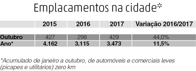 Depois da queda expressiva em 2016 na venda de automóveis e comerciais leves (picapes e utilitários) novos, o ano de 2017 vem tendo uma forte retomada. Dados do Renavam divulgados ontem revelam que Santa Maria fechou o mês de outubro com um emplacamento de 429 veículos zero km, um número 44% maior que os 298 registrados em outubro de 2016. Com isso, voltou-se ao patamar de outubro de 2015, quando tinham sido 427 unidades. Os dados daqui foram melhores do que no país, que teve aumento de 27% em outubro.