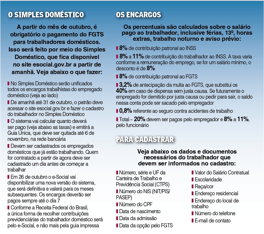 O cadastro no site esocial.gov.br possibilita a emissão de uma guia única para pagamento de todos os encargos trabalhistas dos domésticos, incluindo INSS, FGTS e seguro contra acidente de trabalho. O pagamento das obrigações referentes ao mês de outubro deverá ser feita até 6 de novembro (veja quadro abaixo).