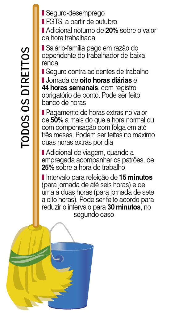 Entram em vigor nesta quinta-feira os direitos que faltavam aos trabalhadores domésticos. Depois de anos de espera, o Fundo de Garantia por Tempo de Serviço (FGTS) começará a ser recolhido obrigatoriamente pelos empregadores a partir de outubro. De 1º a 31 de outubro, patrões devem fazer o cadastro dos empregados no Simples Doméstico, pela internet.