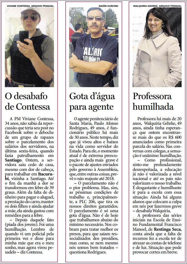 Situação que gerou um post em tom de desabafo da soldado da BM de Santiago, Viviane Contessa, 34 anos, no Facebook, com mais de 6,5 mil compartilhamentos até o começo da noite de ontem.