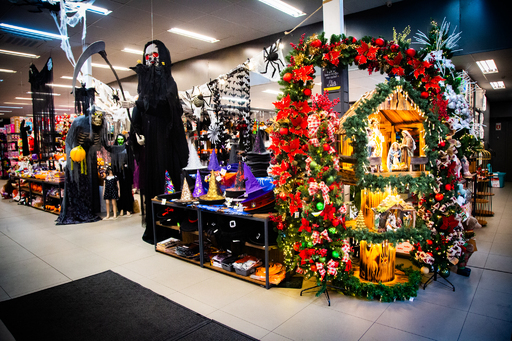 Na loja, pelo segundo ano consecutivo, os papais noéis compartilham as prateleiras com caveiras, bruxas e esqueletos pendurados para o Halloween, tradicional feriado norte-americano comemorado no dia 31 de outubro. Mesmo dividindo espaço, a venda dos itens sombrios de Dia das Bruxas não prejudica o Natal, data mais lucrativa do ano para os lojistas.