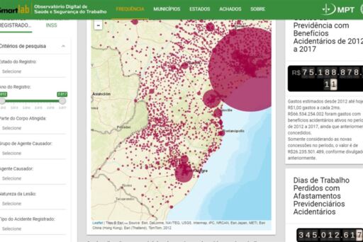 O Observatório Digital de Saúde e Segurança do Trabalho, mantido pelo Ministério Público do Trabalho, tem um mapa digital e interativo (acima) em que é possível acompanhar as alarmantes estatísticas de acidentes de trabalho no país e, também, por cidade. Clicando no mapa do site, chega-se à informação de que, só em Santa Maria, de 2012 a 2017, foram registrados 4.925 casos de acidentes de trabalho, o que inclui 15 mortes de trabalhadores. E possivelmente há muito mais casos, pois nem tudo que ocorre é registrado.
