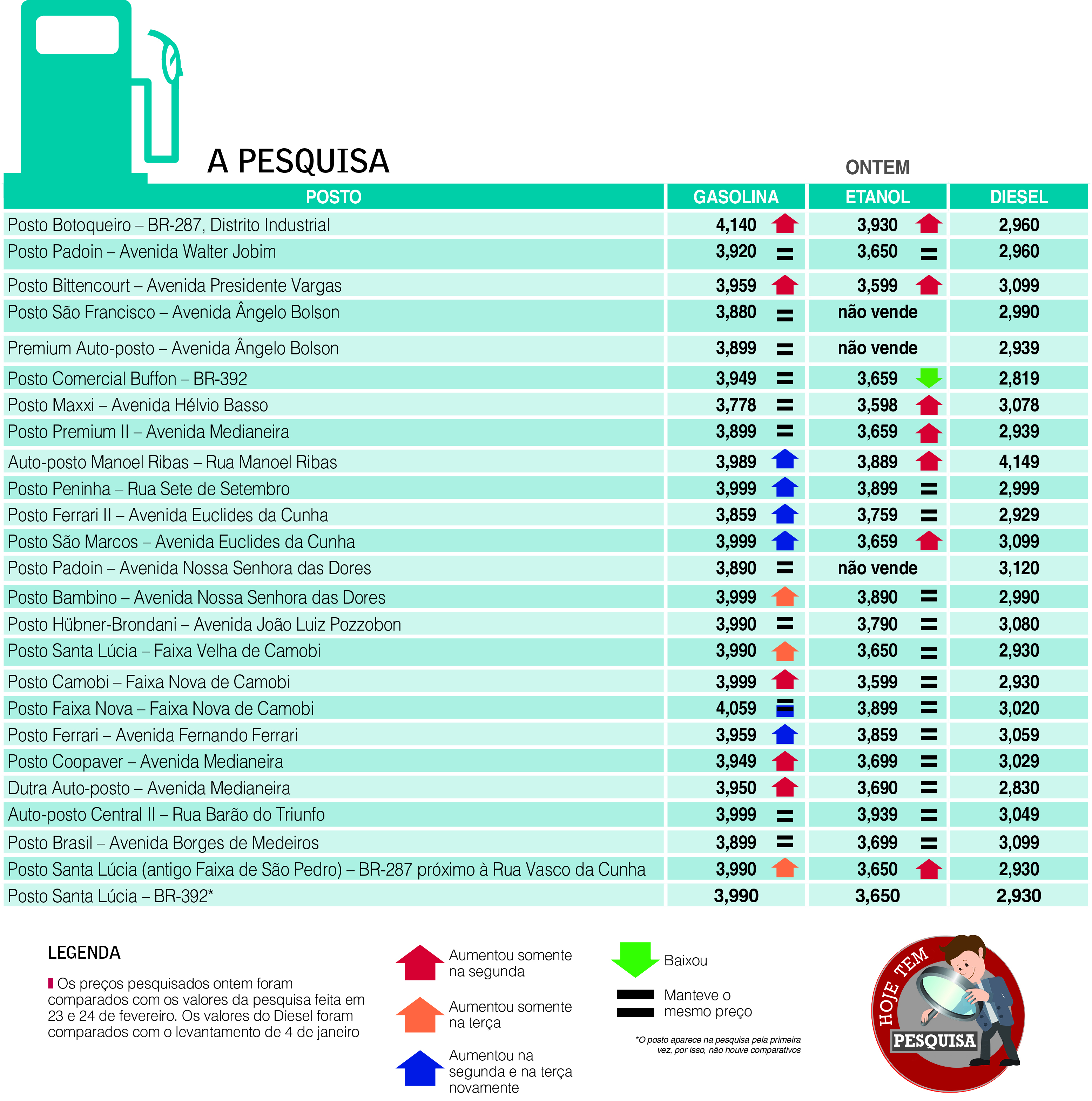 Conforme a pesquisa, o posto Maxxi, na Avenida Hélvio Basso, que não repassou a alta, é o que vende a gasolina mais barata, a R$ 3,778. Já o Posto Botoqueiro, na BR-287, é o que vende a gasolina mais cara entre todos os locais pesquisados, com o valor do litro chegando a R$ 4,14.