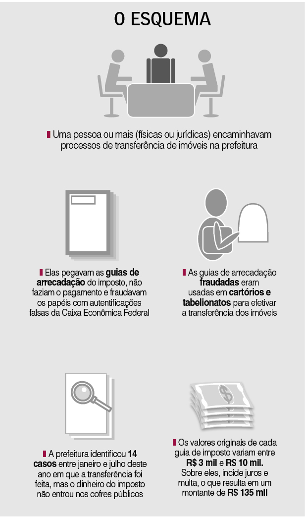 A prefeitura descobriu e a Polícia Civil está investigando uma fraude no pagamento do Imposto de Transferência de Bens Imóveis (ITBI) que chega, inicialmente, a R$ 135 mil. O valor não entrou nos cofres públicos neste ano e deixou de ser investido em educação, saúde e outros serviços à população. Até o momento, foram descobertos 14 casos entre janeiro e julho de 2015. E o desvio pode ser ainda maior. O município investigará casos suspeitos dos últimos cinco anos.