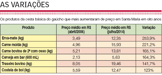 Está mais caro manter as tradições gaúchas. E bota mais caro nisso. Um estudo divulgado nesta quarta-feira pelo curso de Ciências Econômicas do Centro Universitário Franciscano (Unifra) sobre a inflação em Santa Maria nos últimos oito anos mostra que produtos como a erva-mate e a costela bovina aumentaram 254% e 123%, respectivamente, no período.