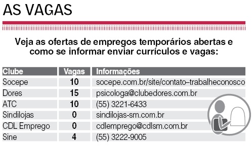 Mesmo assim, quem está à procura de trabalho para o período de férias ou aposta na efetivação depois desse período de experiência pode deixar seu currículo na agência da Fundação Gaúcha do Trabalho e Assistência Social e Sistema Nacional do Emprego (FGTAS/Sine), no Sindilojas, na CDL Emprego e em empresas especializadas, como a Futura e a Ello.