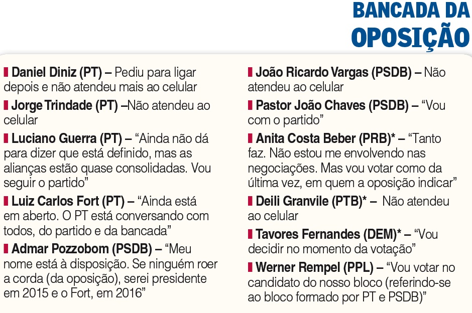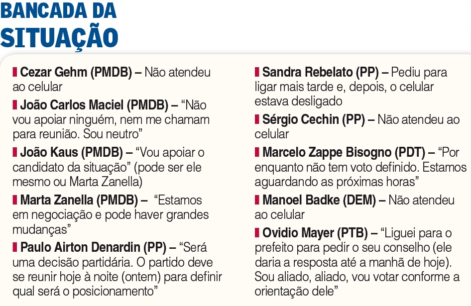 A poucas horas da eleição, a disputa segue em aberto, assim como as respostas da maioria dos vereadores procurados ontem pelo "Diário" (veja no quadro abaixo). A oposição tem um discurso mais afinado do que o da situação, mas os bastidores revelam descontentamentos e tentativas de alianças esdrúxulas em ambos os lados.