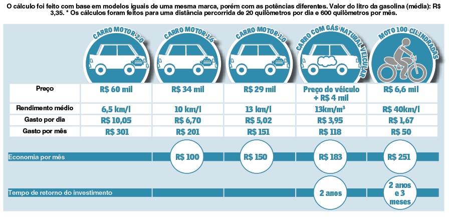 Em relação à economia de combustível, a instalação do sistema de Gás Natural Veicular (GNV) pode ser uma alternativa à gasolina até para quem anda pouco. Se rodar cerca de 20 quilômetros por dia, economizará R$ 82 por mês. O investimento inicial será recuperado em quatro anos de uso do gás.