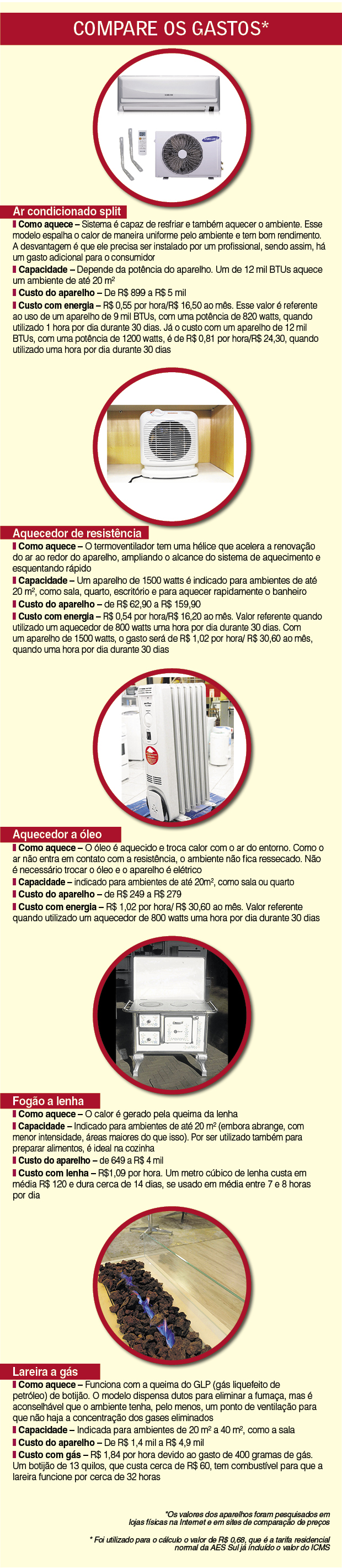 No caso da lareira a gás, o gasto por hora é de R$ 1,84. Com base na tarifa da AES Sul (concessionária que abastece Santa Maria), utilizando um split de 9 mil BTUs uma hora por dia, durante 30 dias, o gasto seria de R$ 0,55 por hora, R$ 1,29 a menos na comparação com a lareira. Segundo o engenheiro eletricista Félix Farret, o custo varia muito de uma residência para outra, em função do número de moradores, das especificações dos ambientes e do tempo de uso dos aparelhos, por exemplo.