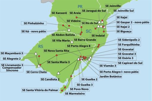 Pontos vermelhos: SE existente ou em construção; triângulos brancos: SE a licitar; e linhas pretas: LT a licitar
