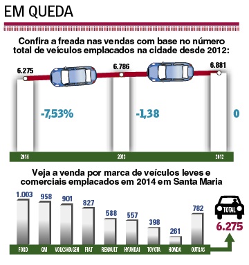 Santa Maria registrou uma freada forte na venda de veículos no último ano. Fechado o balanço de dezembro, mês que foi de recuperação para as concessionárias, em todo o ano de 2014 a queda nos emplacamentos foi de 7,53% em relação a 2013. A cidade apenas respondeu a tendência de queda registrada em todo o país nos últimos dois anos.