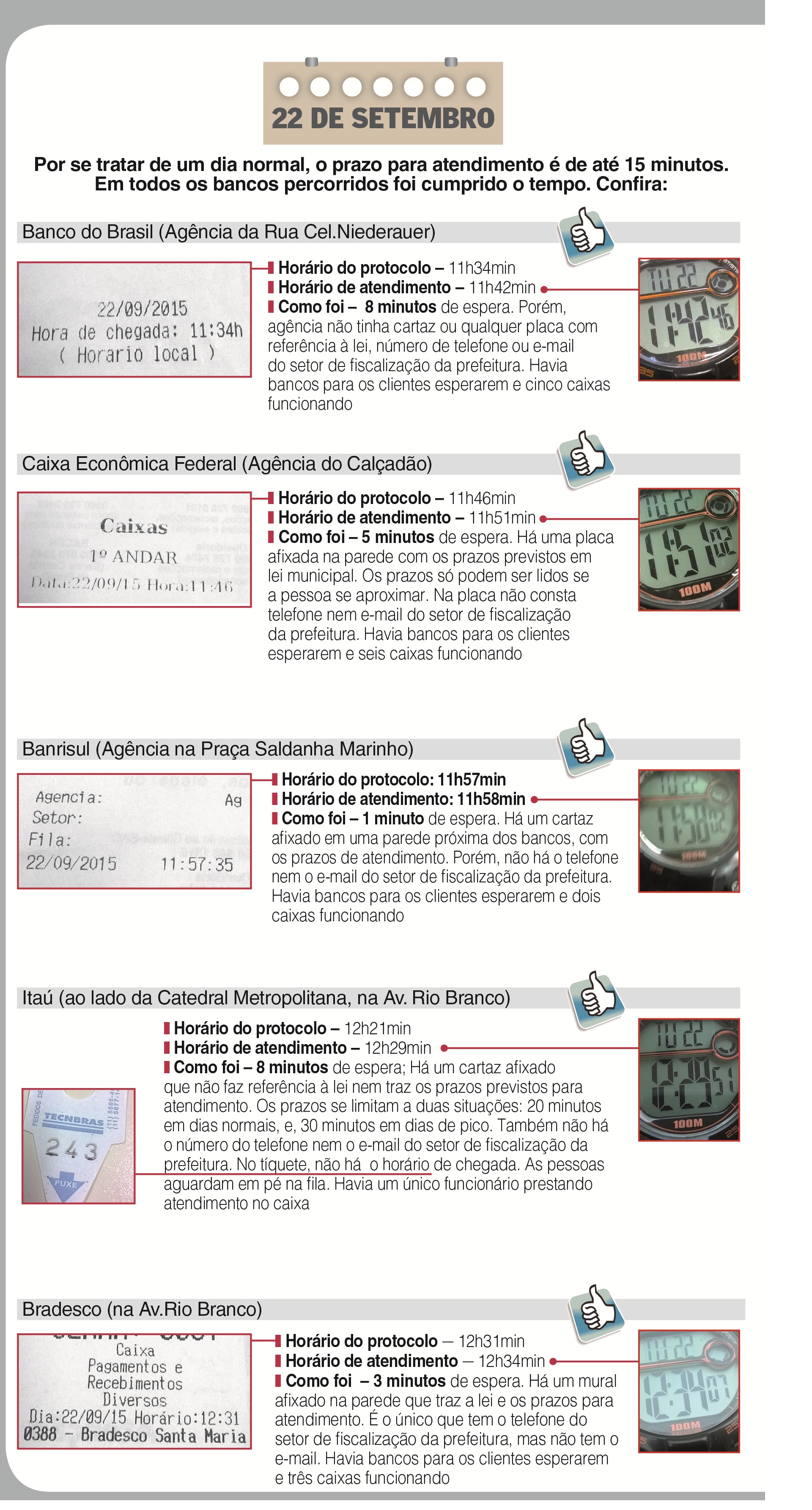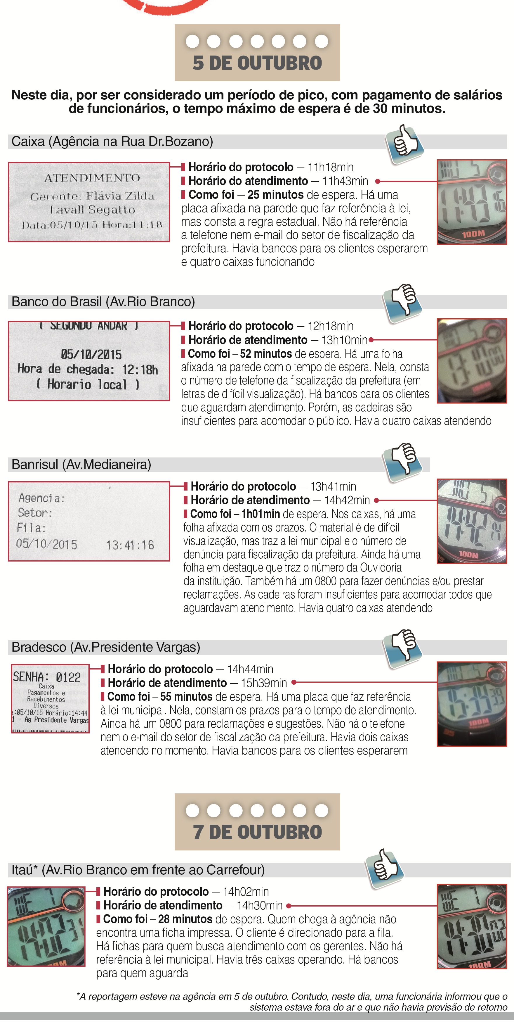 O "Diário" percorreu, em pelo menos dois momentos distintos, cinco agências bancárias de Santa Maria _ três públicas e as duas maiores privadas do município. O propósito foi colocar à prova a lei municipal, que é de 2003, e tenta regrar o atendimento nos locais.