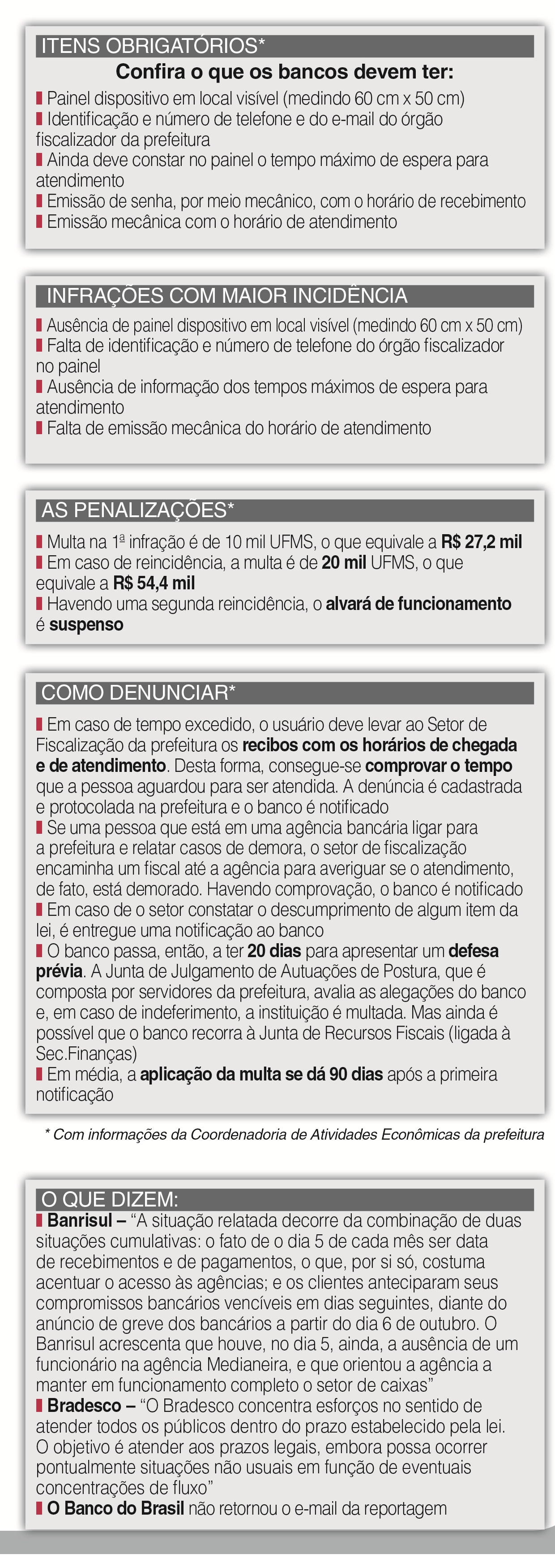 Para saber se a lei, de fato, está sendo cumprida, a fiscalização cabe à Coordenadoria de Atividades Econômicas, ligada à Secretaria de Desenvolvimento Urbano, que assumiu a função em abril deste ano. No entanto, a tarefa já foi de outras pastas: Turismo e Controle e Mobilidade Urbana. Por isso, não há um histórico sobre fiscalizações. Não se sabe quantas agências bancárias foram multadas ou a que tem a maior incidência de infrações.