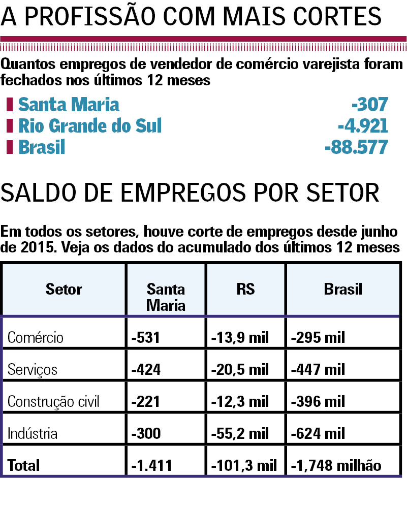 No balanço das profissões com mais abertura e fechamento de empregos neste ano em Santa Maria, o destaque negativo foi para vendedor do comércio varejista, com 114 postos fechados desde janeiro, conforme a Página 2 noticiou nesta segunda-feira. Porém, no acumulado dos últimos 12 meses, o quadro é bem pior, com o corte de 307 vendedores. E não é só em Santa Maria que vendedor lojista é a profissão com mais cortes (veja detalhes no quadro abaixo).