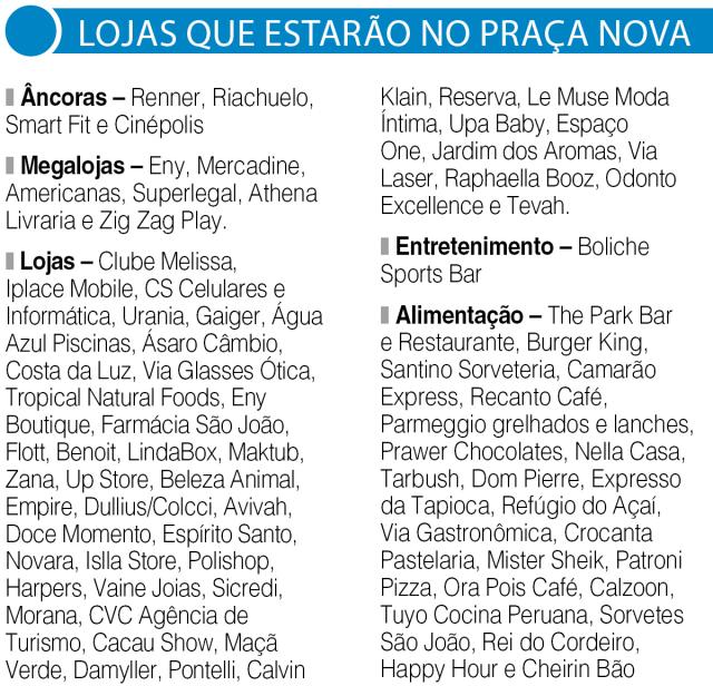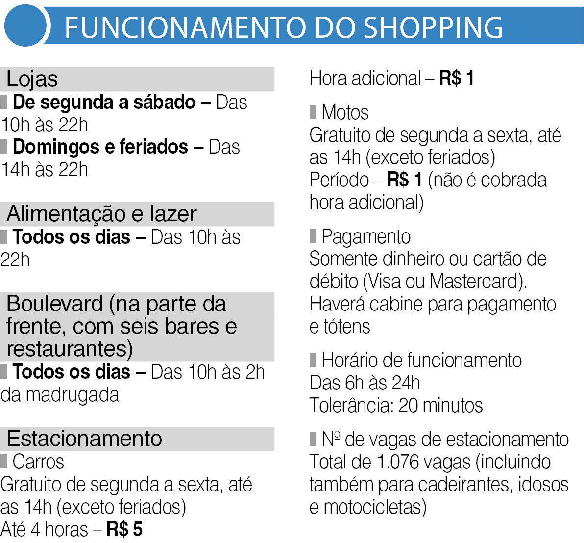 Dos 22 mil m² de área bruta locável, 83% estão comercializados. Quando totalmente ocupado, deverá contar com cerca de 200 operações, entre lojas, restaurantes, bares e fast foods (veja quadro). Além disso, deve gerar 1,5 mil empregos diretos e indiretos. O estacionamento comportará 1.076 veículos. Nesta quinta, às 13h, o Dnit vai liberar o trânsito na parte inferior do viaduto que dá acesso ao shopping.