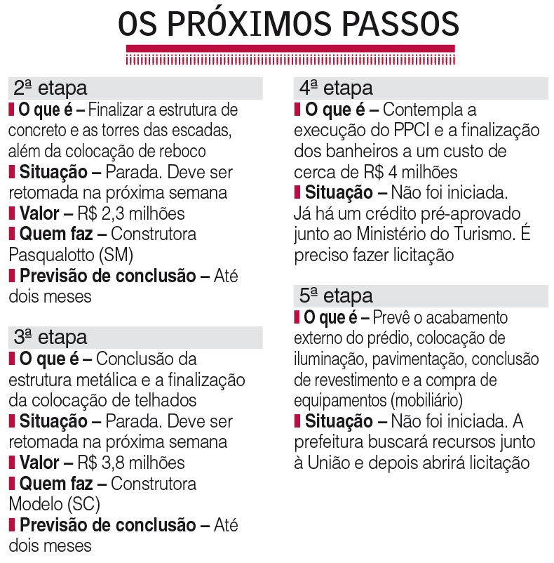 O Executivo municipal projeta que o local volte a ser um canteiro de obras na semana que vem. Isso só será possível porque houve um entendimento entre o governo local e a construtora Pasqualotto, de Santa Maria, que está responsável pela execução da segunda etapa do centro de eventos. Esta fase envolve a finalização da estrutura de concreto e as torres das escadas, além da colocação de reboco.