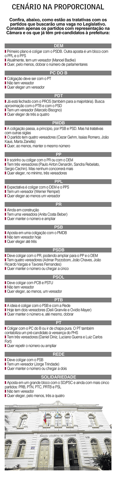 DEM, PR e Rede têm, cada, uma cadeira. E trabalham para manterem e ampliarem o leque de representatividade. O PPL também tem uma cadeira, mas o principal nome da sigla, Werner Rempel, concorrerá à prefeitura.